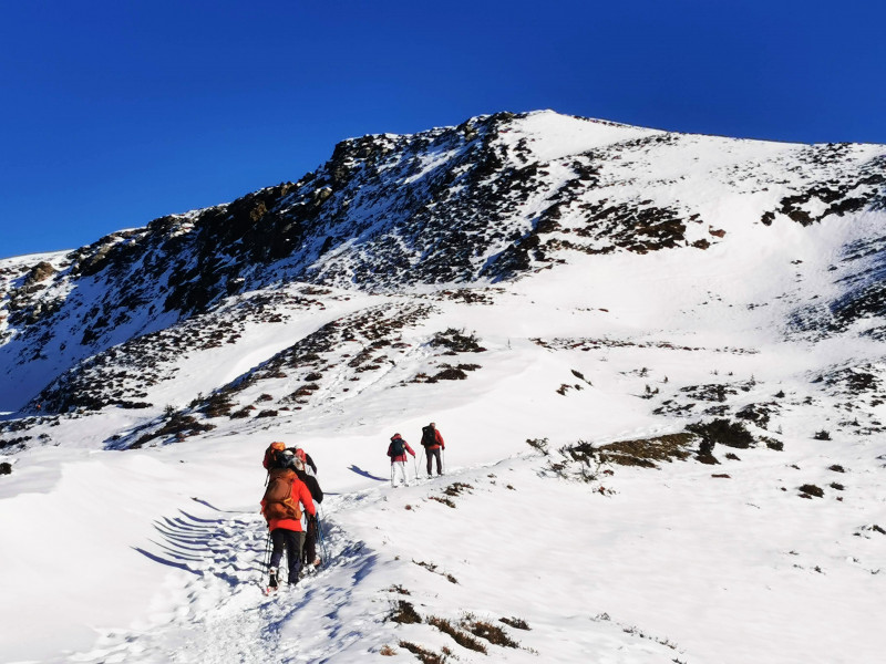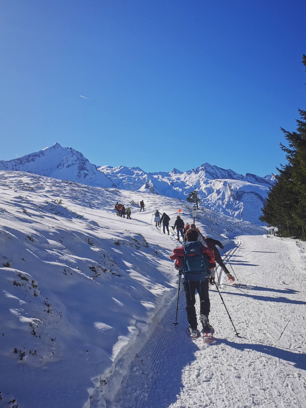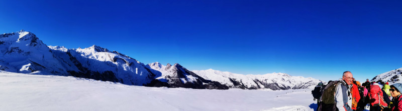 Tous arrivés sur place, le soleil nous réchauffe déjà, nous chaussons les raquettes et c'est parti pour 9 kms. La neige est dense, le ciel bleu azur, les paysages grandioses à 360°que demander de mieux...