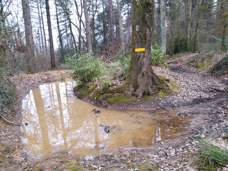 Nous continuons sur ce sentier qui nous mène  plus loin vers  « le trou de la bombe ». Ce trou a été fait lors d’un bombardement du château de Montjoie le 6 juin 1944 qui était occupé par des maquisards.  Actuellement ce château abrite un foyer de vie et une ferme pour handicapés gérés par l’ADAPEI.