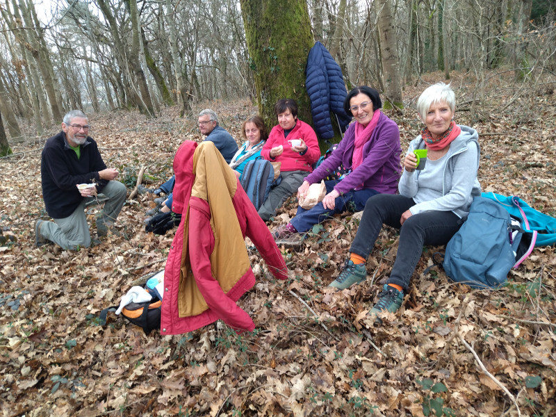 Il est bientôt midi, donc l’heure de chercher un endroit sympathique  pour notre pique-nique. C’est dans un sous-bois que nous nous  installons et chacun cherche la  place qui lui convient. Le temps est agréable même si le soleil nous boude …  Comme d’habitude le chocolat, les gâteaux, le café  sont là.