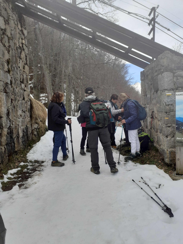 Nous croisons un couple du Lot et Garonne qui trouve l’idée des crampons fort intéressante, surtout quand il apprend que ça se vend par deux (deux comme les deux pieds, lui qui a acheté la veille des raquettes et qui en ouvrant le sac n’en a trouvé qu’une au départ de sa balade !! Ça c’est pour l’anecdote, ça n’apporte rien au récit, je vous le concède.)